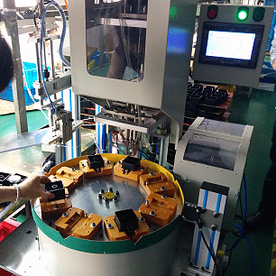 - 1. 通過分度轉盤實現夾具循環(huán)圓周步進流水作業(yè),放入產品、機器組裝、檢測、送螺釘、 擰螺釘、自動卸料等工作同步進行,機器效能大大提高。
